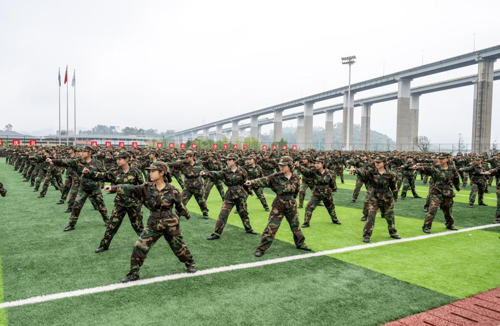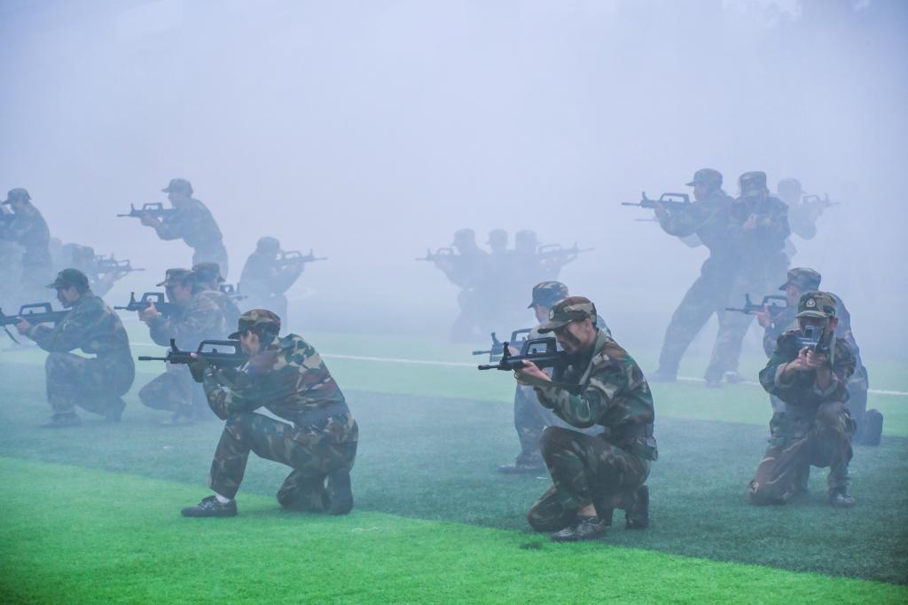 国歌声声催奋进,红旗猎猎映青春。军事训练成果汇报表演由20个军训连队以自信的姿态和昂扬的斗志依次走过主席台接受检阅。队列整齐划一,展现出军人服从命令、听从指挥的优良作风;匕首操女兵的巾帼风采赢得热烈掌声;刺杀操应急棍术气势如虹,战术队形灵活变换,军体拳其劲如铁,展现出重工大学子铿锵斗志。