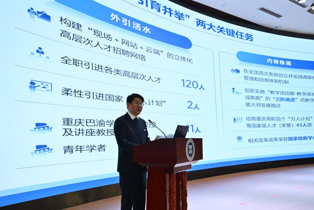 大会第一阶段,叶盛平代表重庆市人力资源和社会保障局致辞。他指出,重庆正迭代升级 “33618” 现代制造业集群体系,亟需高层次技术技能人才,学校作为全市职业教育 “排头兵”,召开此次大会意义重大。市人社局将从政策保障、技能竞赛平台搭建、人才服务优化三方面,为学校人才队伍建设提供精准支持,共同营造 “近悦远来” 的人才生态。