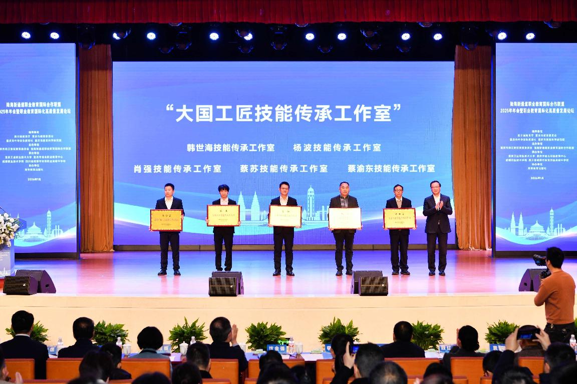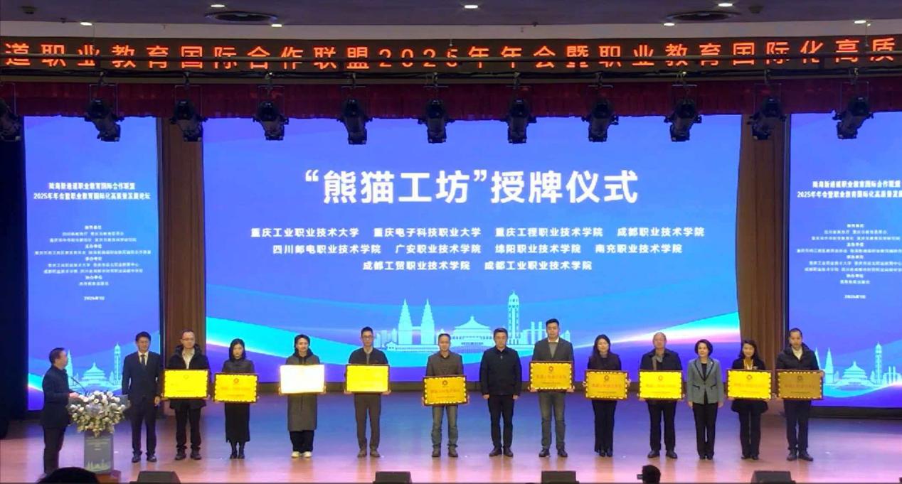 李劲渝、任丽娟及重庆工业职业技术大学校长周传德为“熊猫工坊”嘉宾授牌。“熊猫工坊”作为彰显中国特色、融合区域文化的职教出海品牌,既是我国文化软实力的生动体现,也是推动中华优秀文化国际传播的重要载体。
