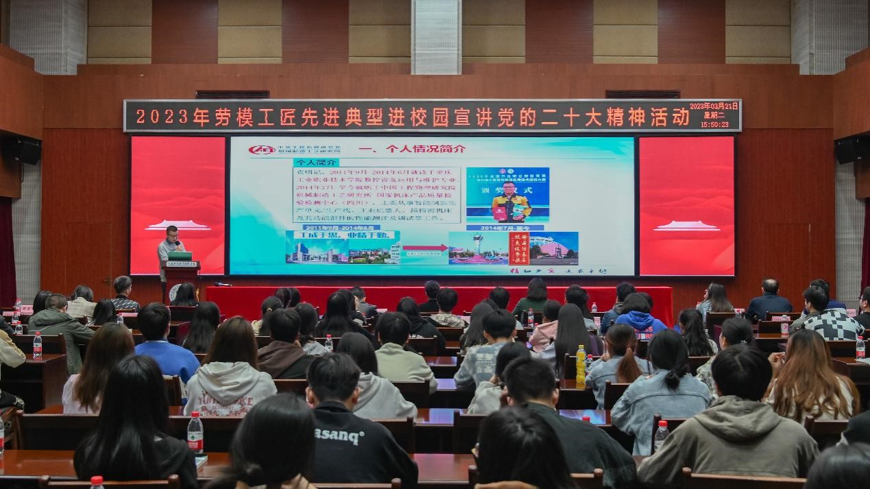 为深入学习宣传贯彻党的二十大精神,扎实落实市委六届二次全会精神,大力弘扬劳模精神、劳动精神、工匠精神,充分发挥先进典型示范作用,推动党的二十大精神落地生根、深入基层、深入群众。日前,学校工会邀请了中国工程物理研究院机械制造工艺研究所“成都工匠”“全国技术能手”袁明记来校作“劳模工匠先进典型进校园”宣讲党的二十大精神专题报告。学校领导、各分工会教职工代表及学生代表100余人参加活动。