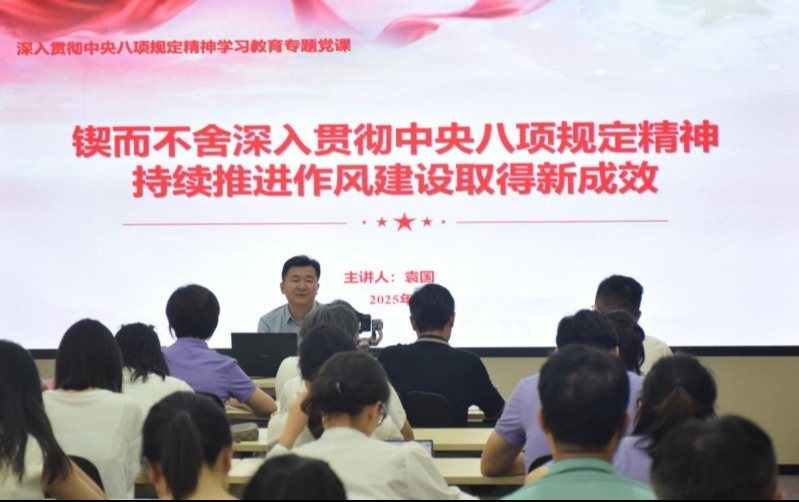 6月9日,学校党委委员、副院长袁国以《锲而不舍深入贯彻中央八项规定精神 持续推进作风建设取得新成效》为题,为财务与资产管理处(采购与招投标中心)、基建后勤处、经济与管理学院师生党员讲授专题党课。此次党课紧扣中央最新文件精神,紧密结合学校实际工作,深入阐释了中央八项规定精神的时代内涵与实践要求。
